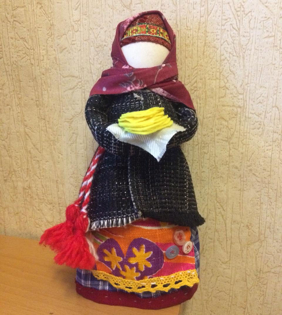 Куколка изображает молодую хозяйку, может, на первом году замужества, которая угощает гостей своими первыми блинами. Одета она в зимнюю одежду, в руках стопка блинов.